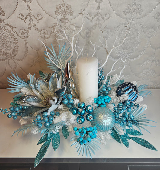 Weihnachtsgesteck + 1 Kerze, Geschenk, Tischdekor, Tischgesteck, Winterdekor,Advent weiss türkis silber