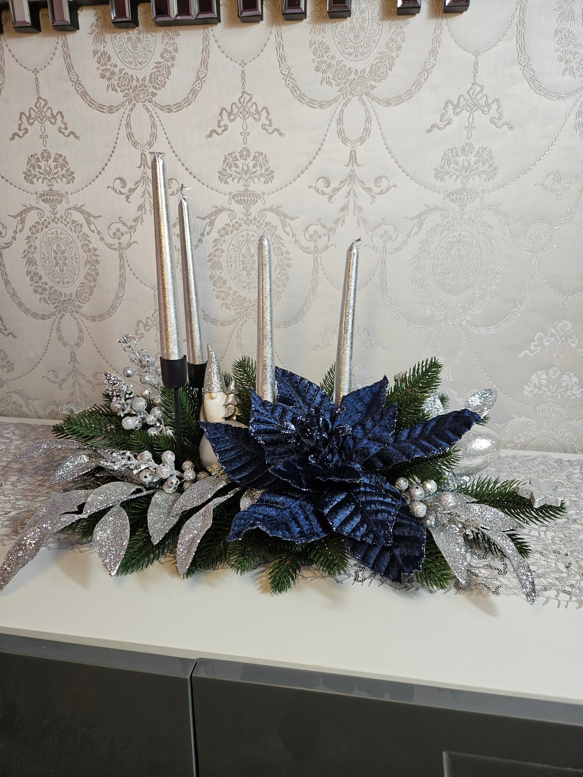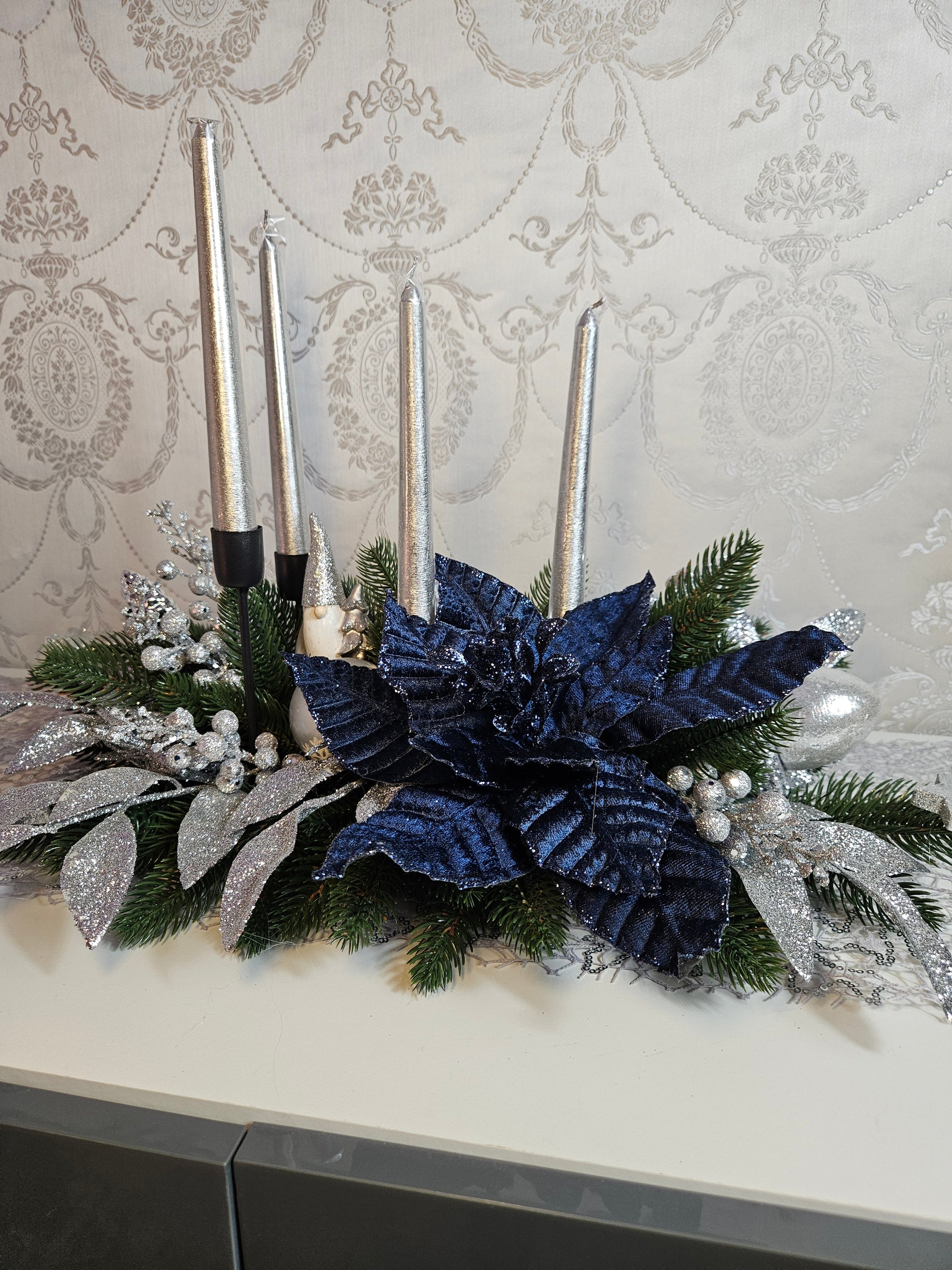 Advent Weihnachtsdekoration Christmas Gesteck + 4 Kerzen Tischdekor Tischgesteck Winterdekor Neuerjahr Christmas Dekorationen grün dunkelblau silber