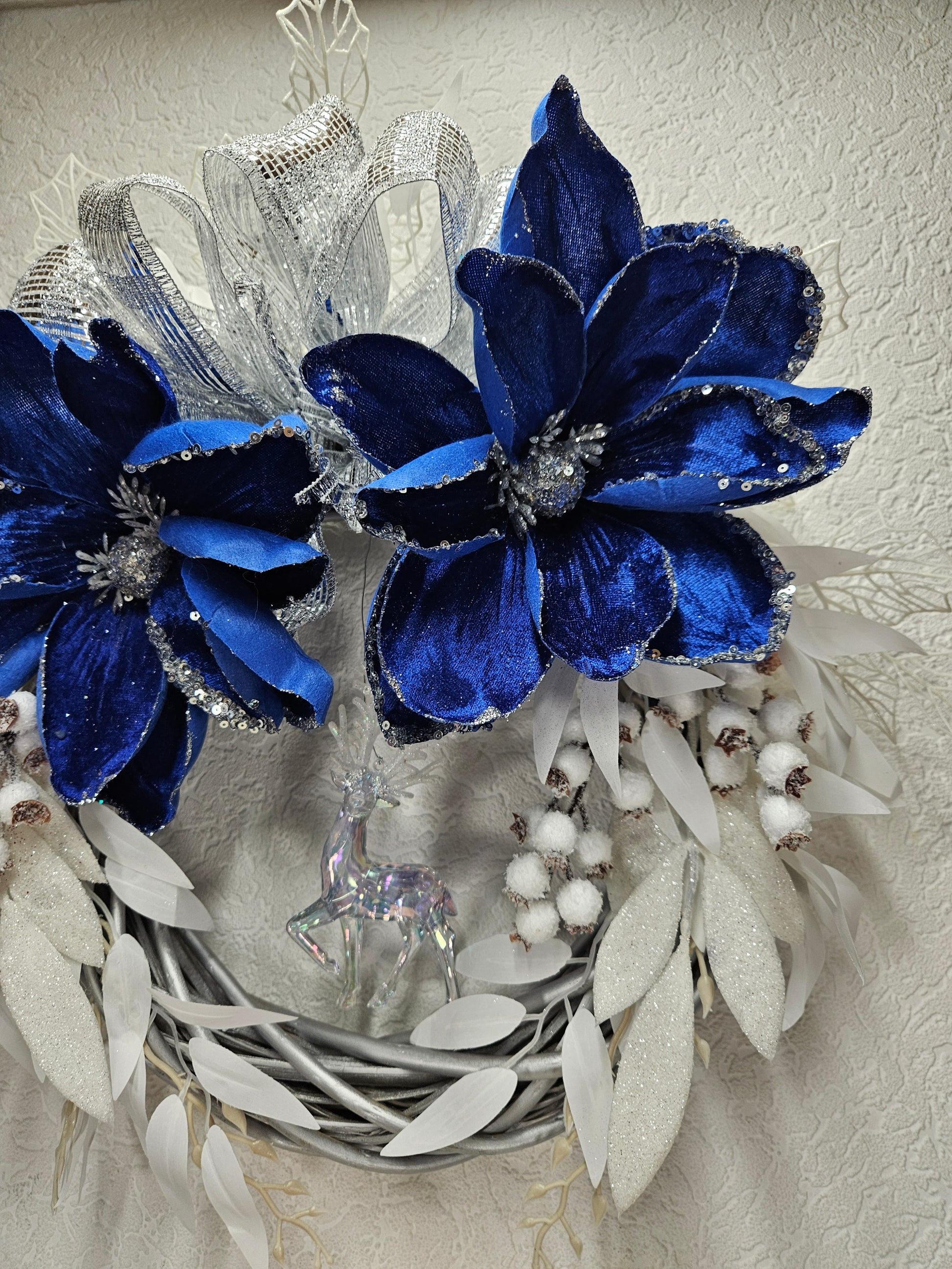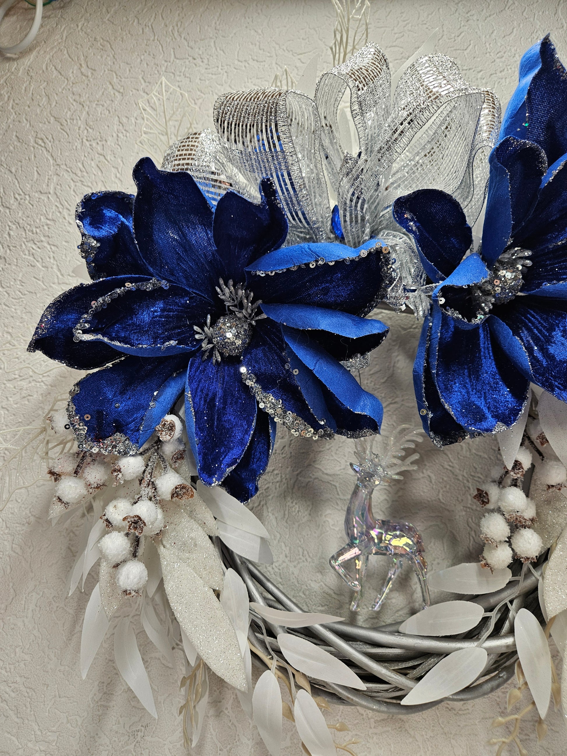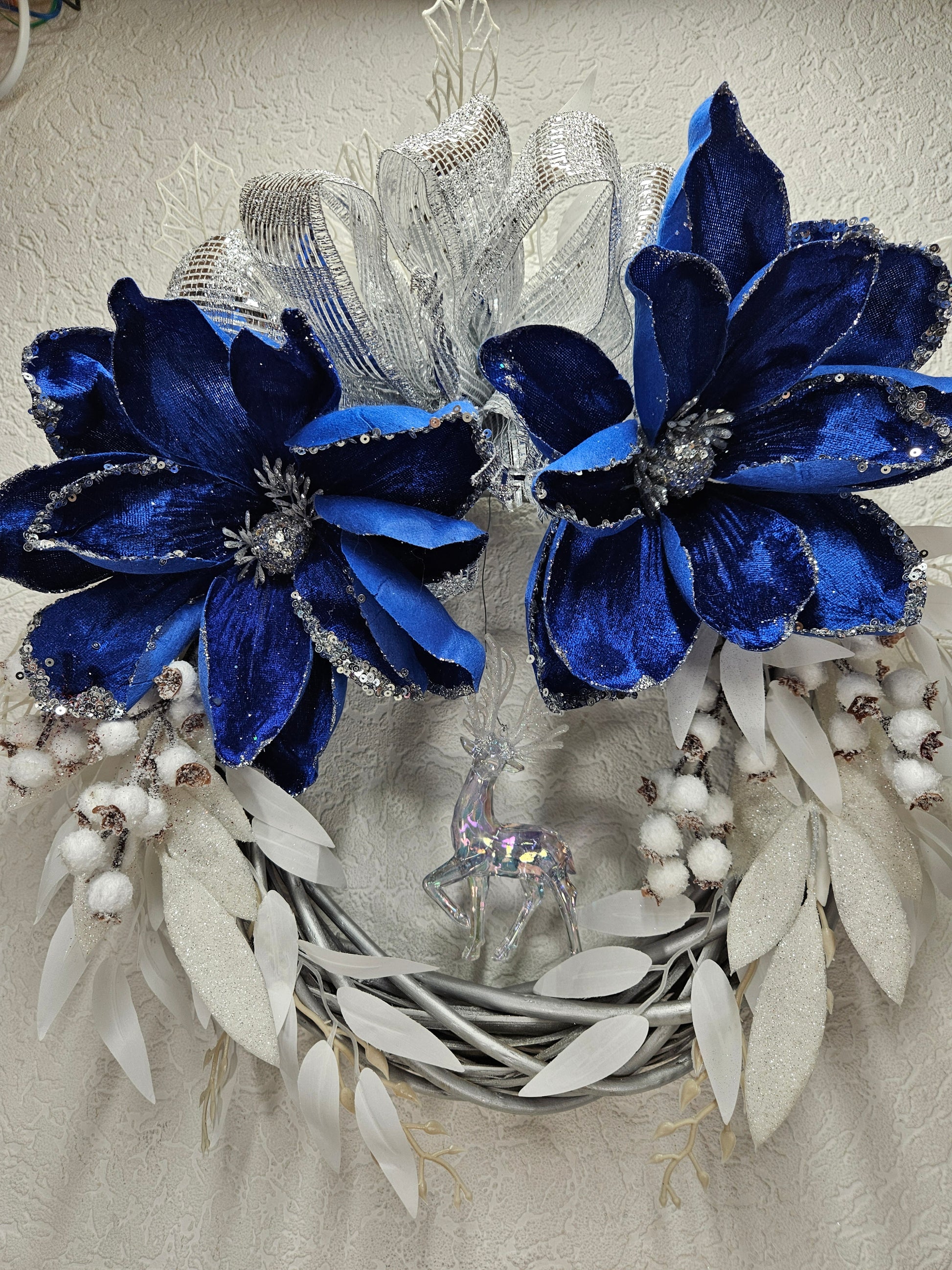Ein Kranz - Wand / Türdekor in den Farben blau, weiß und silber.