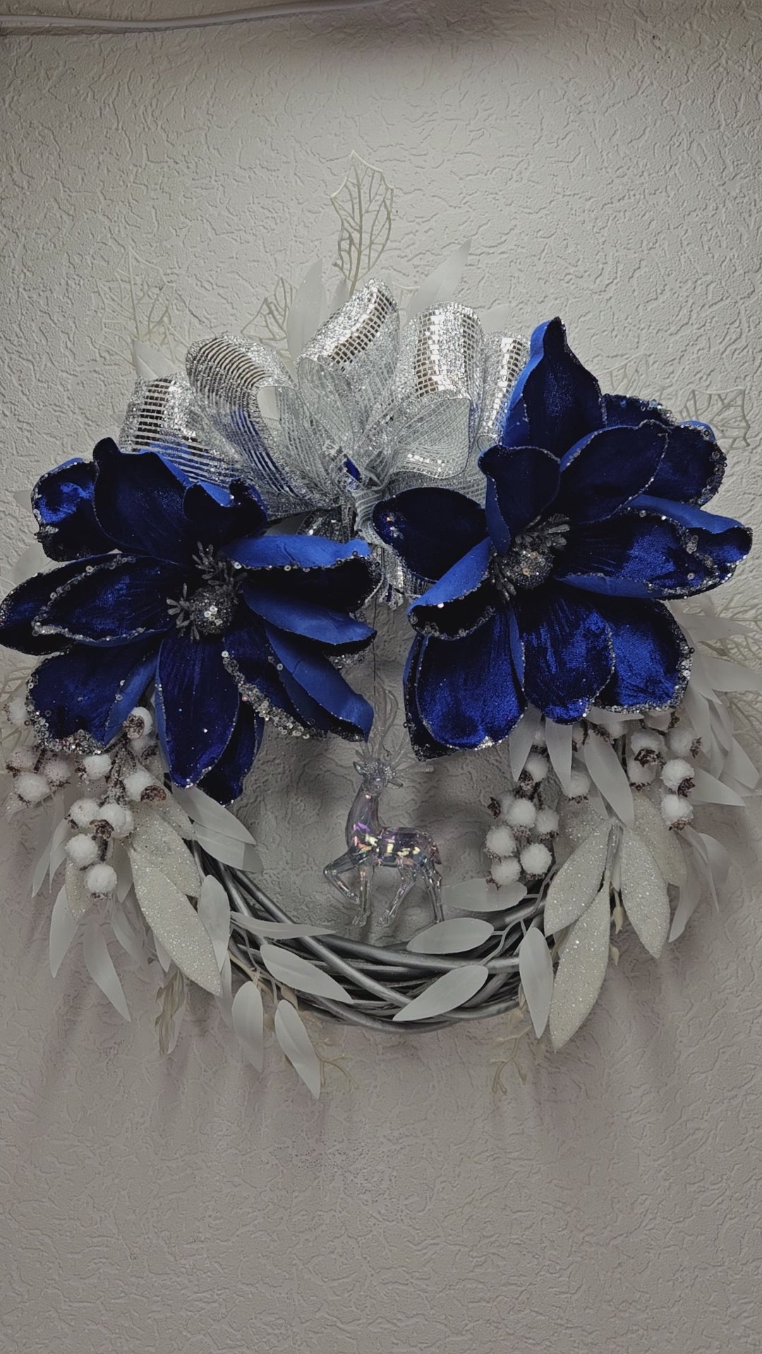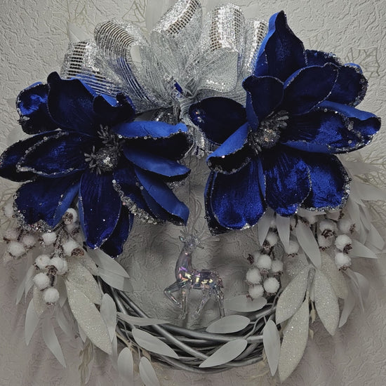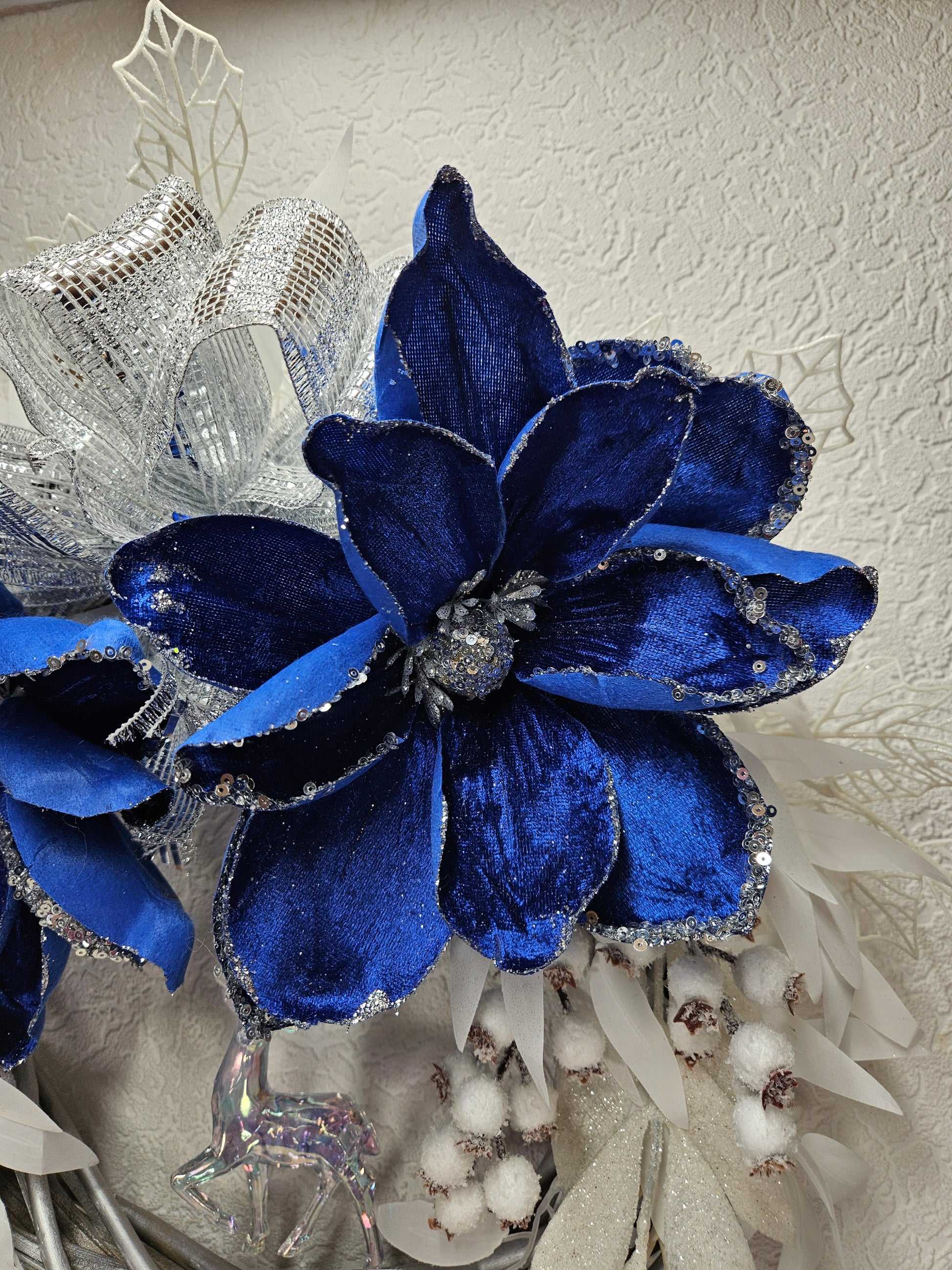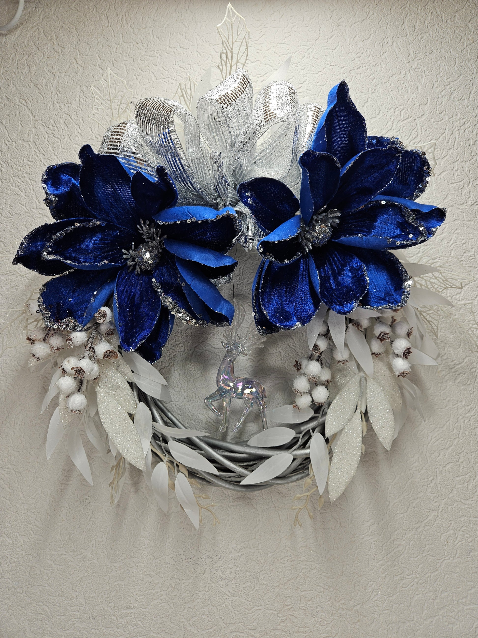 Ein Kranz - Wand / Türdekor in den Farben blau, weiß und silber.