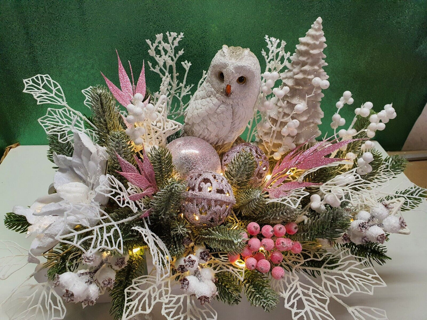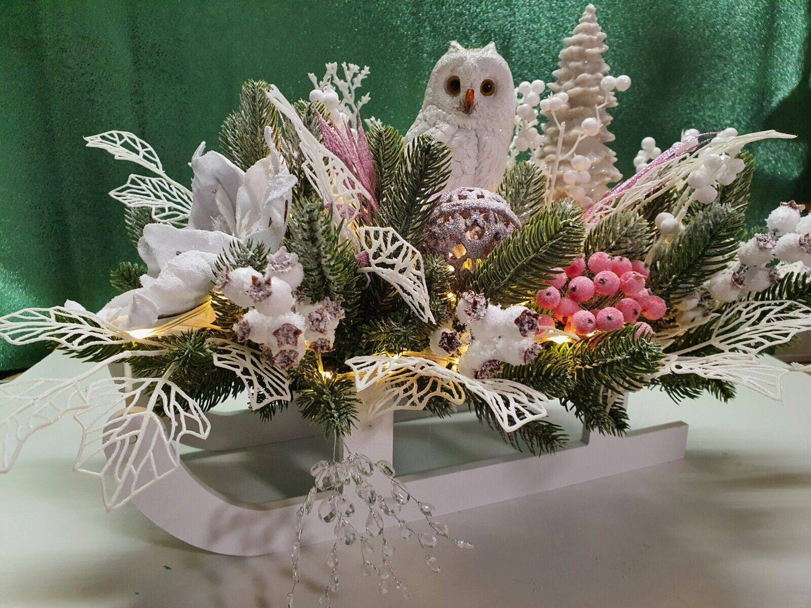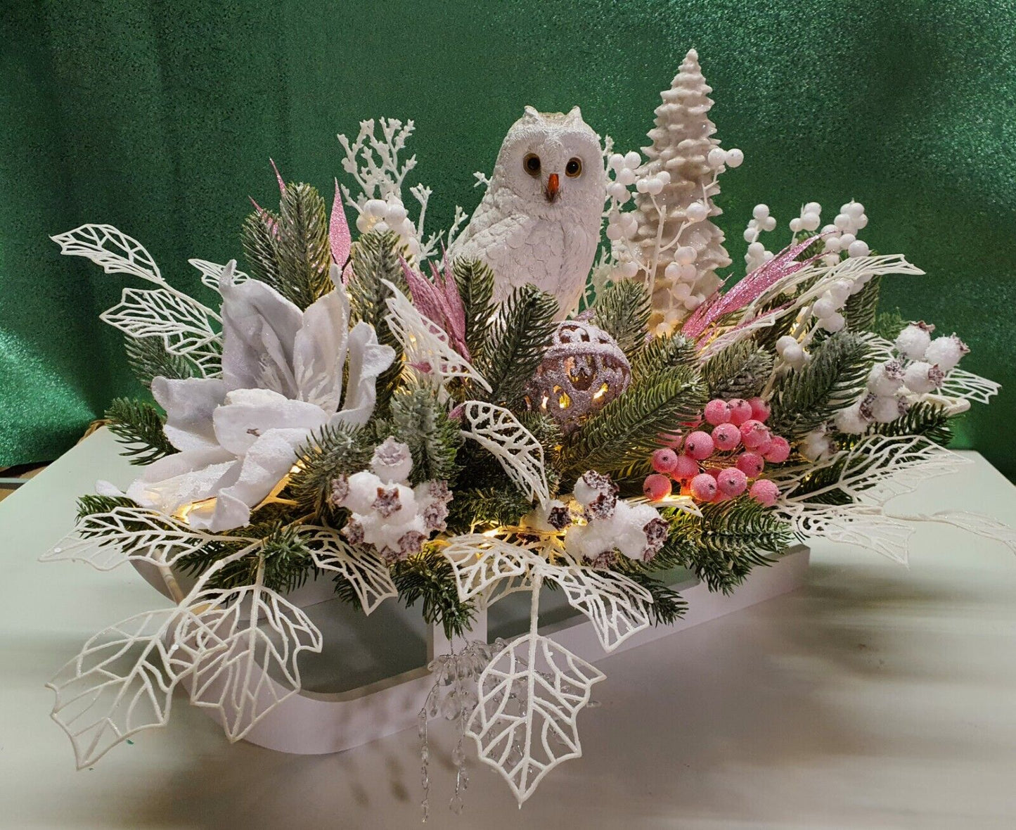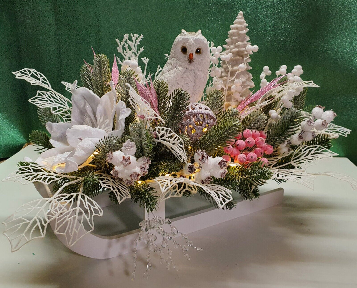 Schlitten mit Eule aus künstlichen grünen Tannenzweigen mit LED in den Farben hellrosa und weiß.